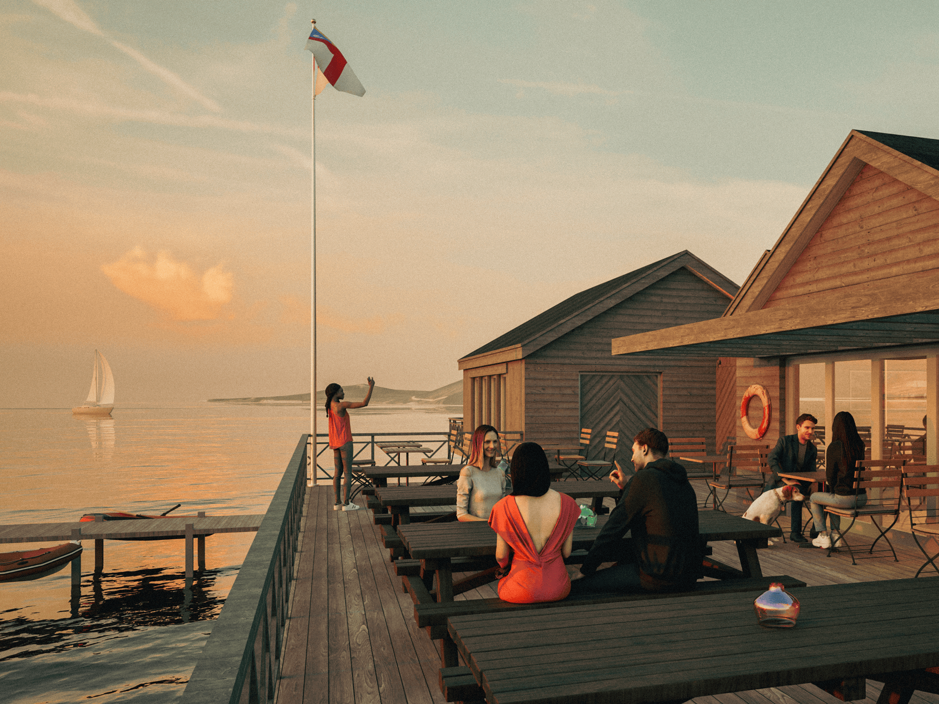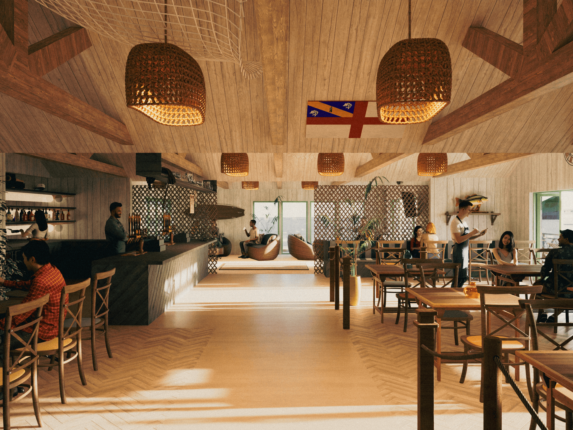 Director Rachel Rogers has long dreamed of this restaurant that captures the soul of island life – rustic, relaxed, and connected to the sea. She handed this vision to architecture student Oli Coupe, who brought it to life as part of an internal design exploration.
